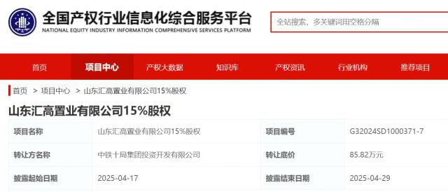 山东汇高置业15%股份在中国中铁挂牌转让,底价85.82万元