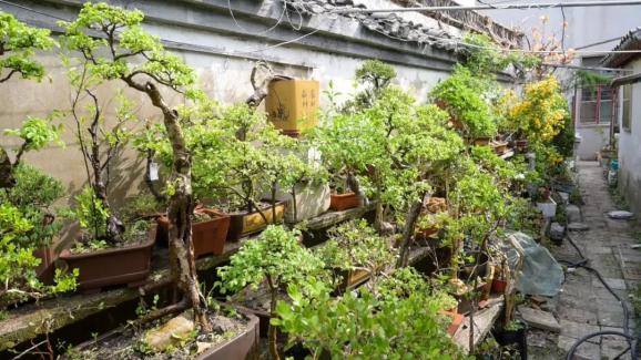 在小院子的地板和架子上,盆景密密麻麻地堆积在一起,有的错综复杂,翠盖遮光,有的悬崖倒挂,飘逸,有的枝叶舒展,婀娜多姿。