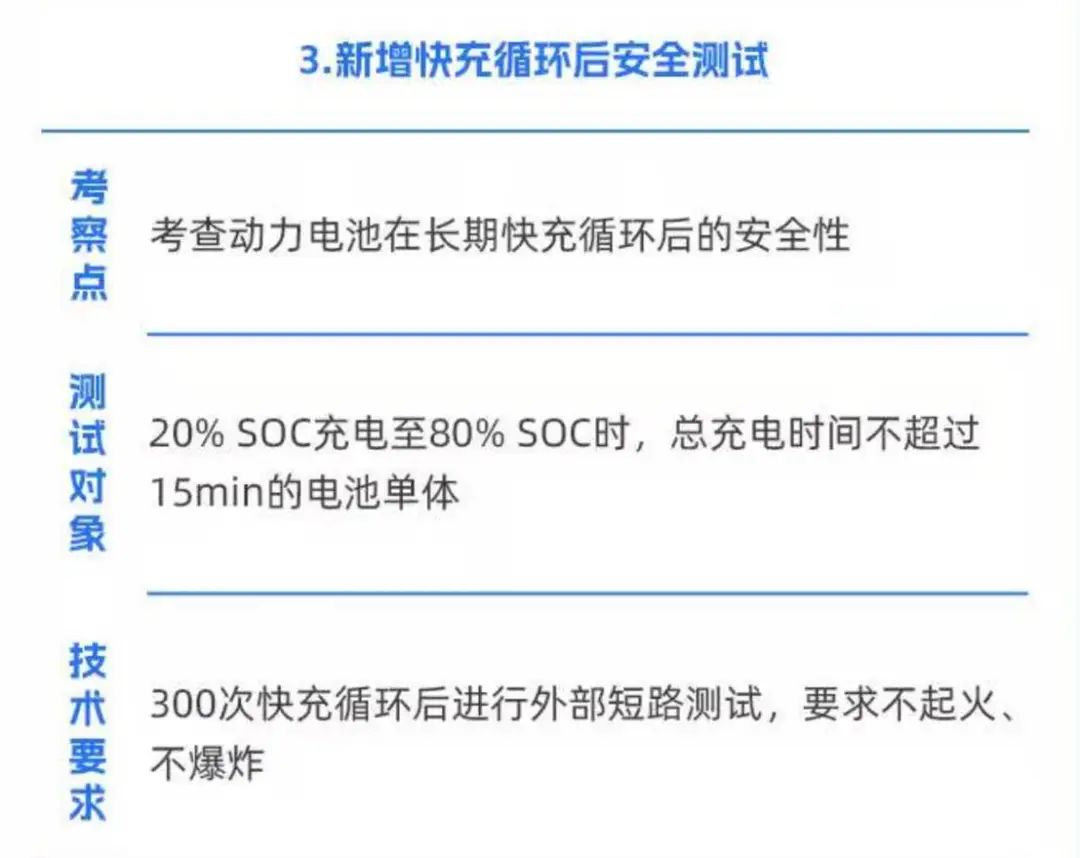 另外,现在800V超快充的普及程度已经很高了,再加上比亚迪制造了兆瓦闪充,新国标对超快充电池的安全性也提出了新的要求。