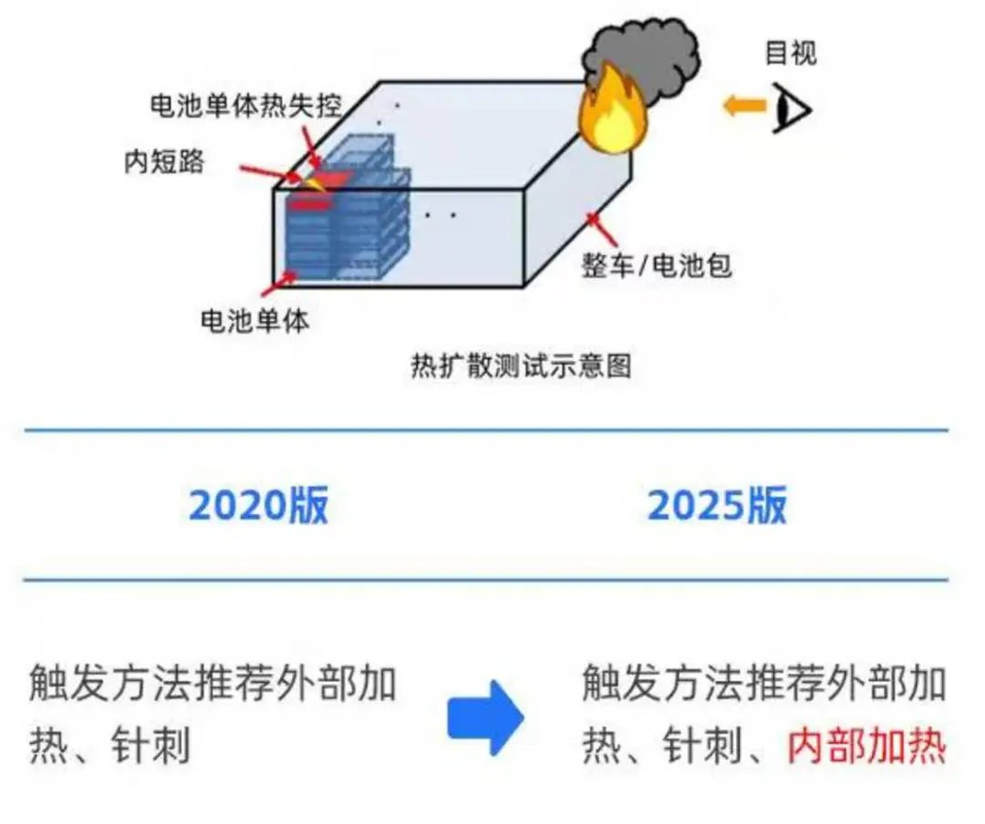 此外,在热失控预警方面,新国标首次要求热失控后5分钟内发出警报信号,报警前后5分钟内不得有可见烟尘进入乘客舱。