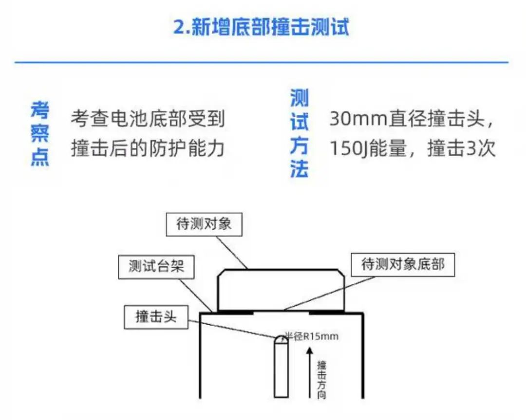 具体要求是,使用一个直径30毫米的钢球,使用150焦耳能量,与电池组碰撞3次后,不会发生火灾、爆炸或液体泄漏。