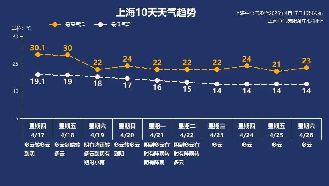 下周一至周二,由于江淮气旋的影响,将迎来另一个明显的降水过程,并伴有强风天气。从周二晚上开始,申城的雨停变成了阴天。下周气温一般在舒适范围内,最低14~16℃,最高21~24℃。