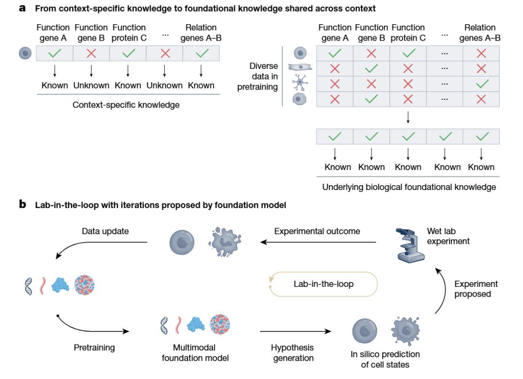图|预训练和不同数据环境下的 Lab-in-the-loop 迭代改善。a. MFM 练习来自丰富背景的生物数据。预训期间,可对具体前后条件的多样化数据进行总结,丰富已知和未知条件下的生物知识表达。在不同细胞状态下,面板中的示例场景反映了归纳基因功能的想法,这有助于推断出在应用中没有看到的功能;b. 模型 - 数据 - 实验,形成自主学习的循环。Lab-in-the-loop 为了不断提高多模态基础模型能力和产生生物学假设的质量,方法产生迭代反馈。