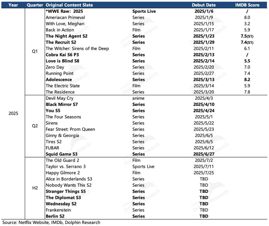 2025年第二季度,海豚君估计顾客的增加还会维持在400万左右。这主要是基于《Black Mirror S7》、《You 还有季末的S5《Squid Games S3等内容。预计下半年将伴随旺季和旺季。《Stranger Things》、《Wednesday》等待更多爆款续集播出,单季用户增长超过500万。