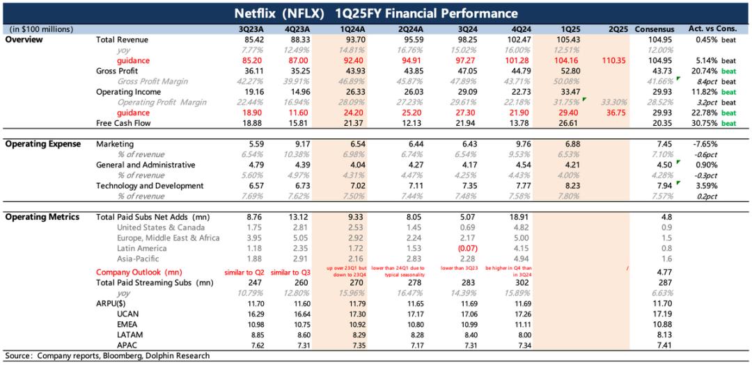 第一季度订阅用户数量增加,海豚君估计超过400万,季节性自然放缓。顾客的增加仍然是由于上季度的结尾内容韩剧。《Squid Game 2》、印度的“NFL板球联赛”和本季度爆红的英剧《Adolescence》,美剧《Beauty in Black》,以及非英语《Medusa S1》、韩剧《苦尽柑来遇见你》等吸引用户,配合继续打击账号密码共享,以及广告套餐的推出。