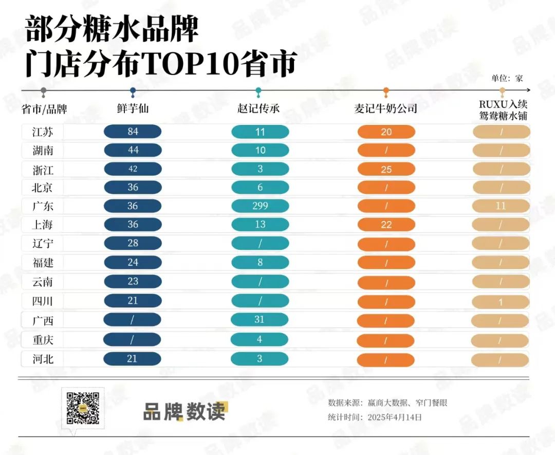 这与糖水起源于岭南的背景是一致的。赵记继承的思路是以广东为基础,北进扩展到华东、华北、西南。但是其他省份只有几十家店,少的是个位。