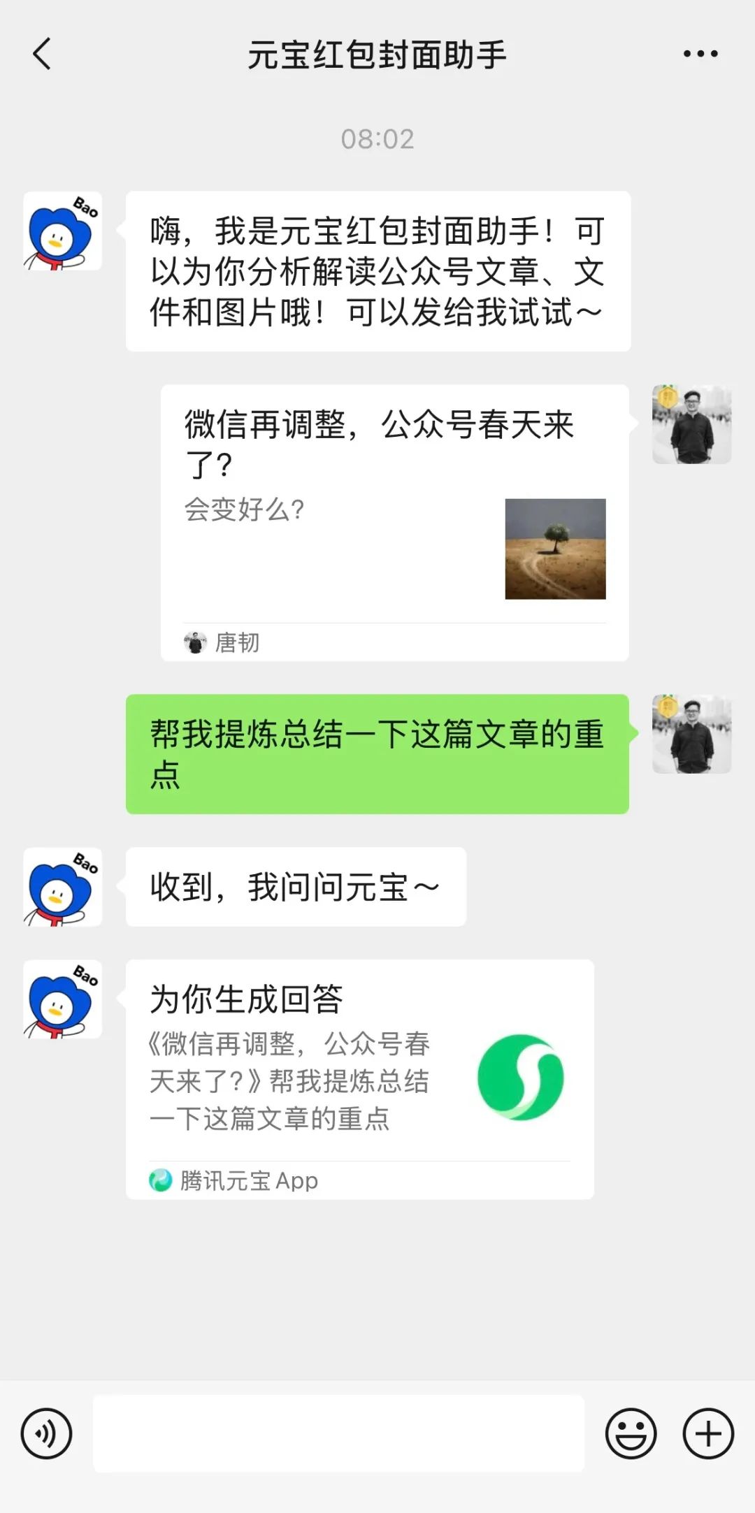 在过去的两天里,我又看到许多媒体在吹微信和元宝的深度融合,可以直接在微信中调用元宝的完整功能。