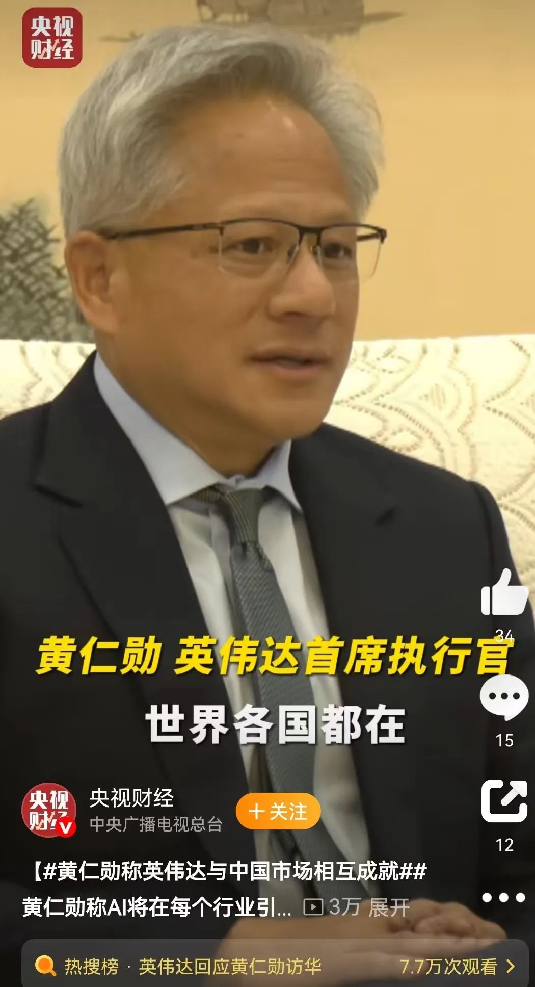 黄仁勋到达北京不到48小时。他明确表示,在过去的30年里,英伟达在中国成长,中国对英伟达非常重要。英伟达和中国市场实现了双赢,将继续为中国市场服务。