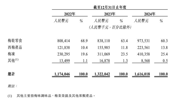 根据业务情况,溜溜果园产品分为梅干零食、西梅产品、梅冻等。其中,梅干零食是公司主要收入。,2024年年收入9.74亿元,占总收入的60.3%;第二大收入来源是梅冻,2024年收入为4.1亿元,占总收入的25.4%。另外,西梅商品同期收入为2.24亿元,占总收入的13.8%。