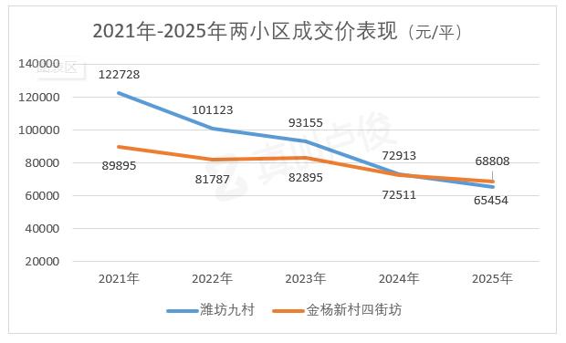 在这里交易比较激烈的学位房,可以分为两种不同的类型 。一种是挂学区的老破小、小户型、低价格,有的还只有小学或初中单学区,以较低的上车门槛凸显性价比。 比如潍坊九村对口一梯队小学,金杨新村四街坊对口二梯队初中。最近15个月,前者平均每月卖出4.3套,后者平均卖出10.5套。交易价格下跌了不少,近年来前者下跌了40%以上,后者下跌了近25%。