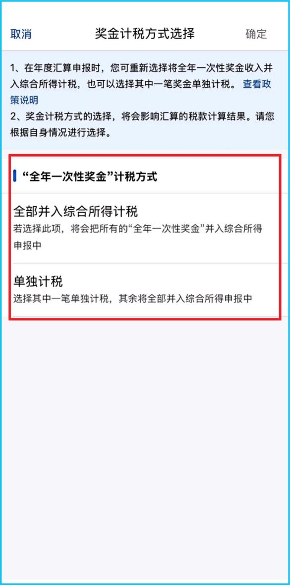 如果有“年度一次性奖金”,点击【工资薪金】进入详情页设置计税方式,建议根据自己的情况选择。如果您想在后续更改奖金计税方式,可以点击【工资薪金】进入工资薪金详情页,点击【奖金计税方式选择】,然后选择计税方式。