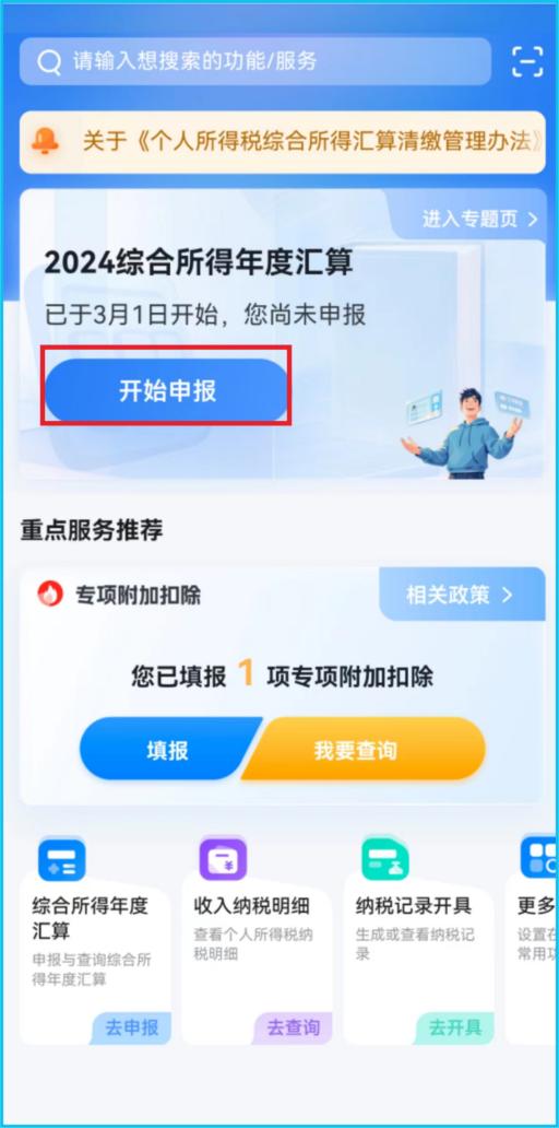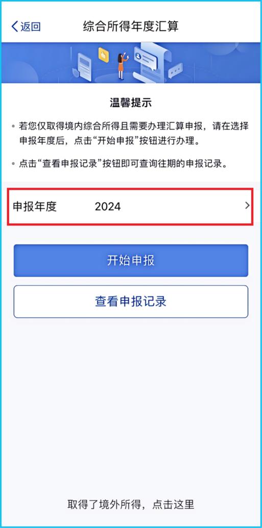 点击首页【2024综合所得年度汇算】-【开始申请】,选择申请年度【2024】,点击【开始申请】。