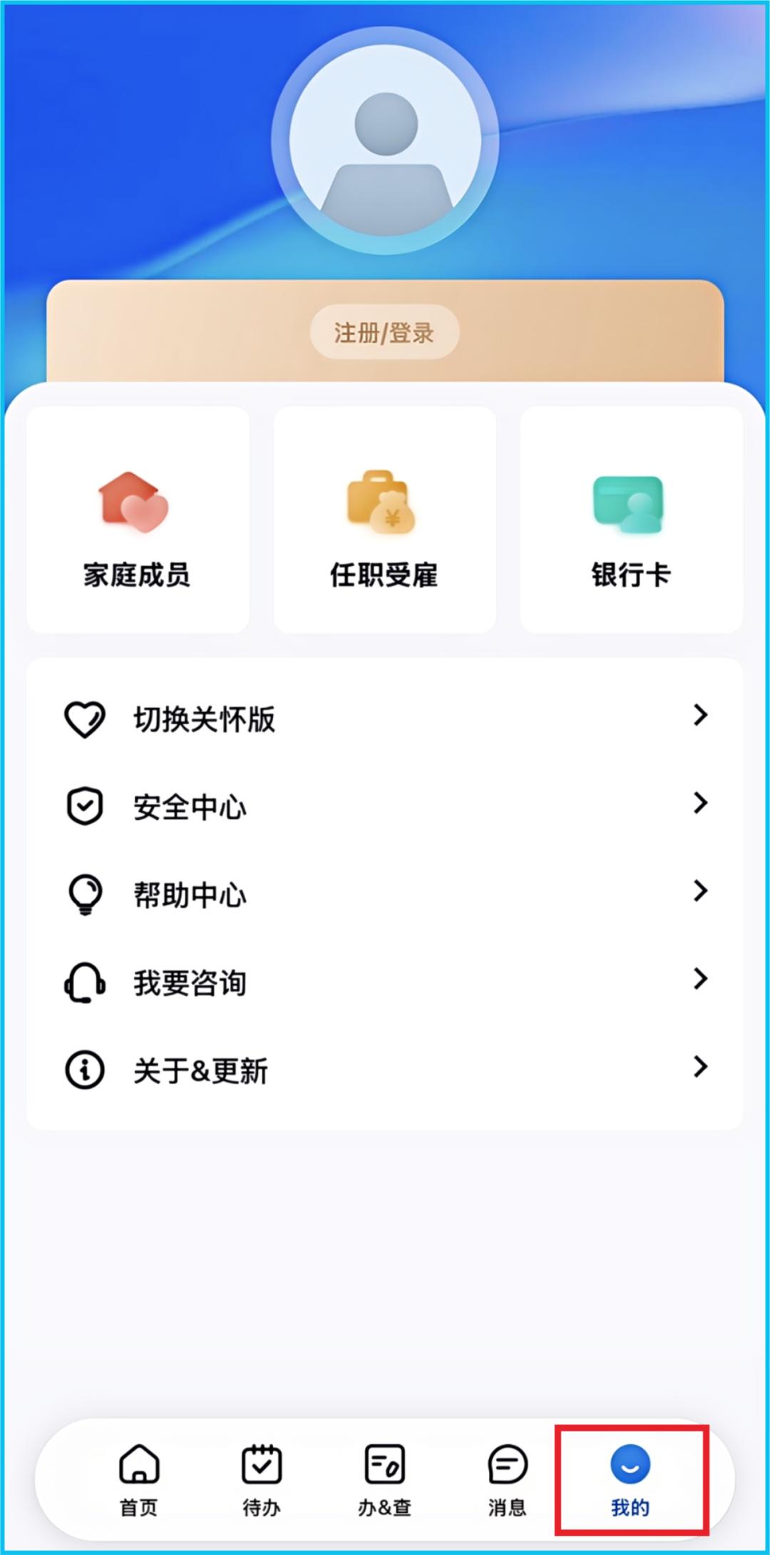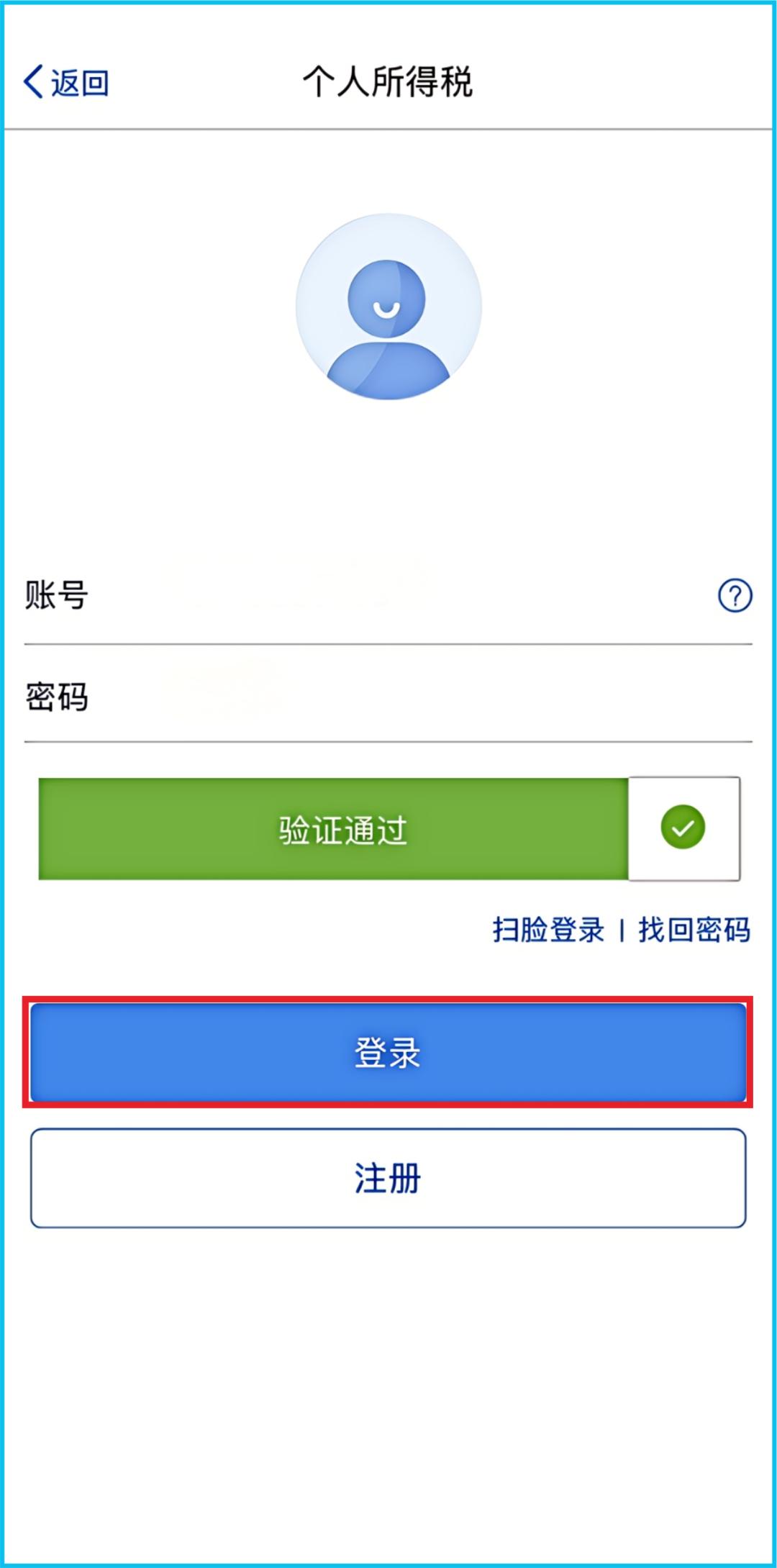 进入税务APP【我的】,点击【注册/登录】,输入帐号,密码,点击【登录】。