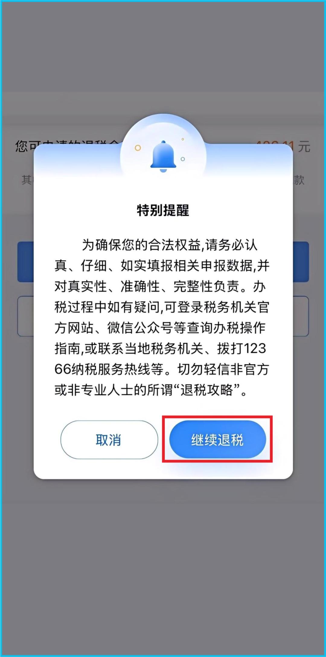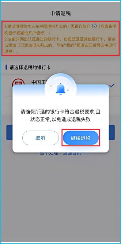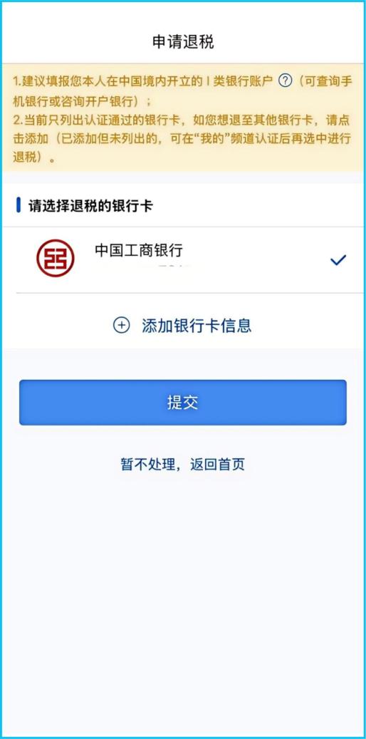 情况一:如果退税申报系统显示“退税”,点击【下一步】,点击【退税申报】。阅读“特别提示”后,点击【继续退税】,选择绑定银行卡,确保所选储蓄卡符合退税要求后点击【提交】,点击【继续退税】完成退税申请。