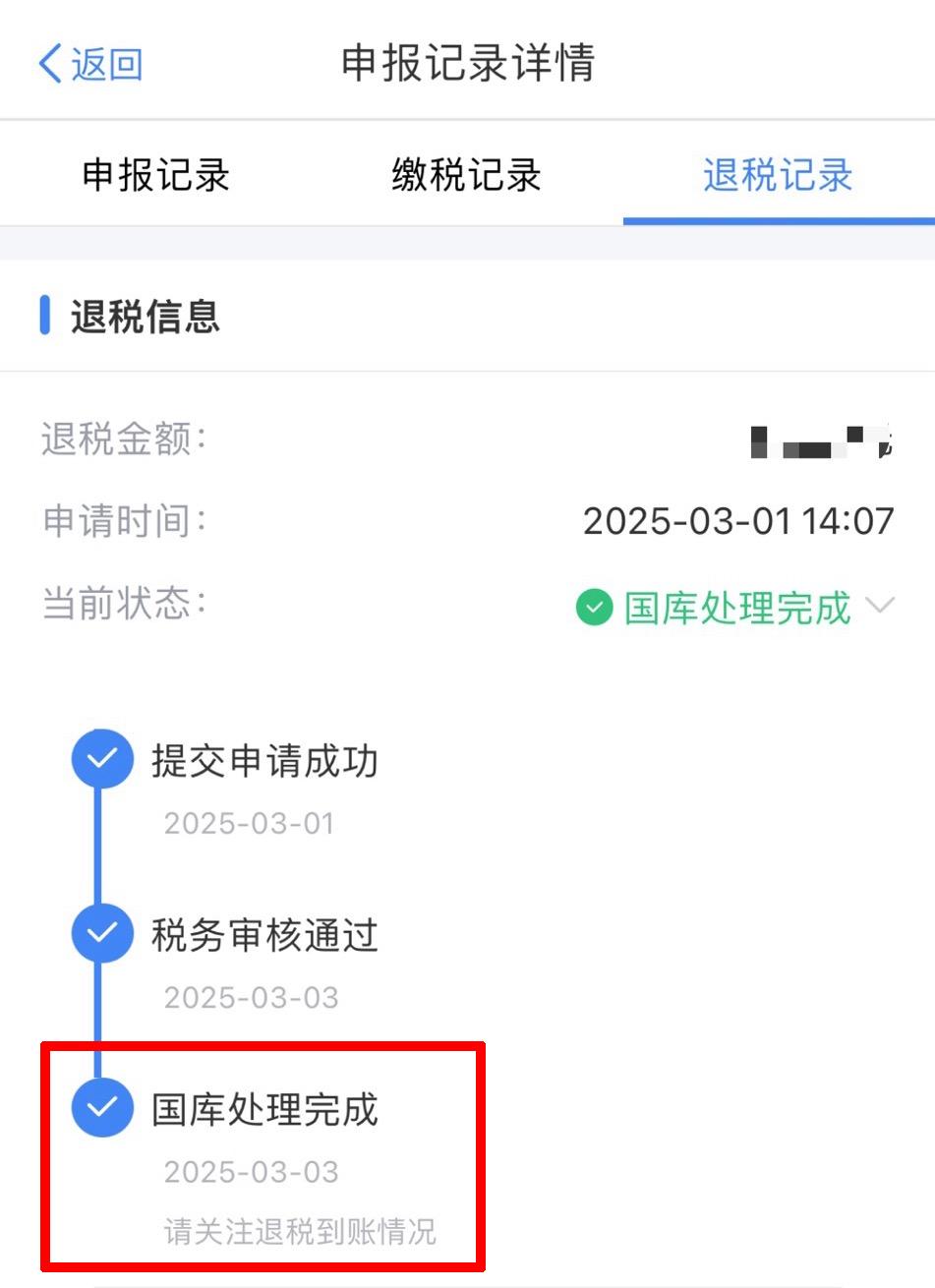 “财务处理完成”表示退税成功,请注意退税是否已退入您提交退税申请时选择的银行卡账户。