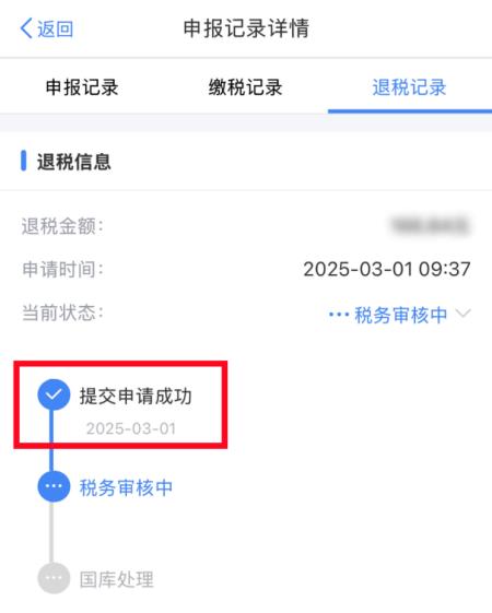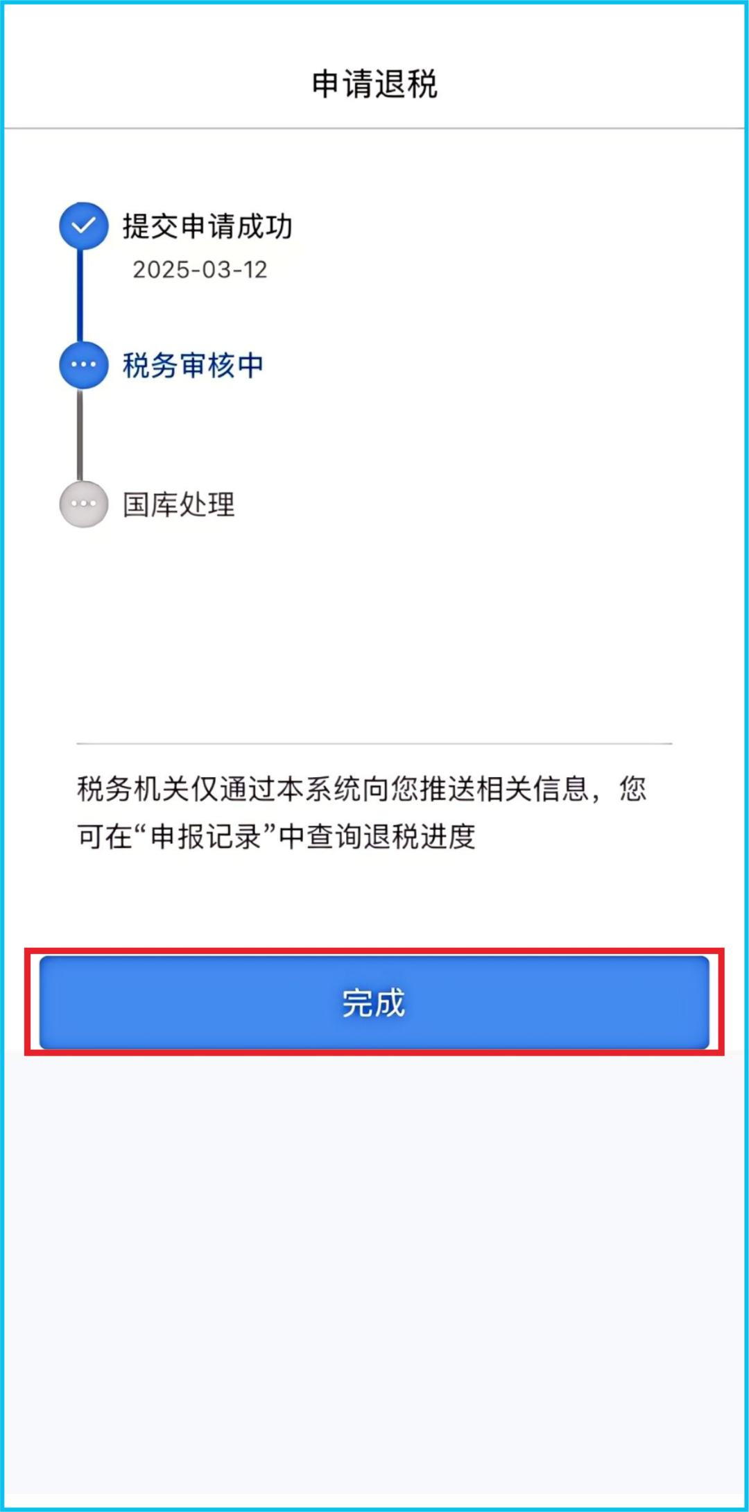 表示已成功提交退税申请,将进入后续流程,请耐心等待。