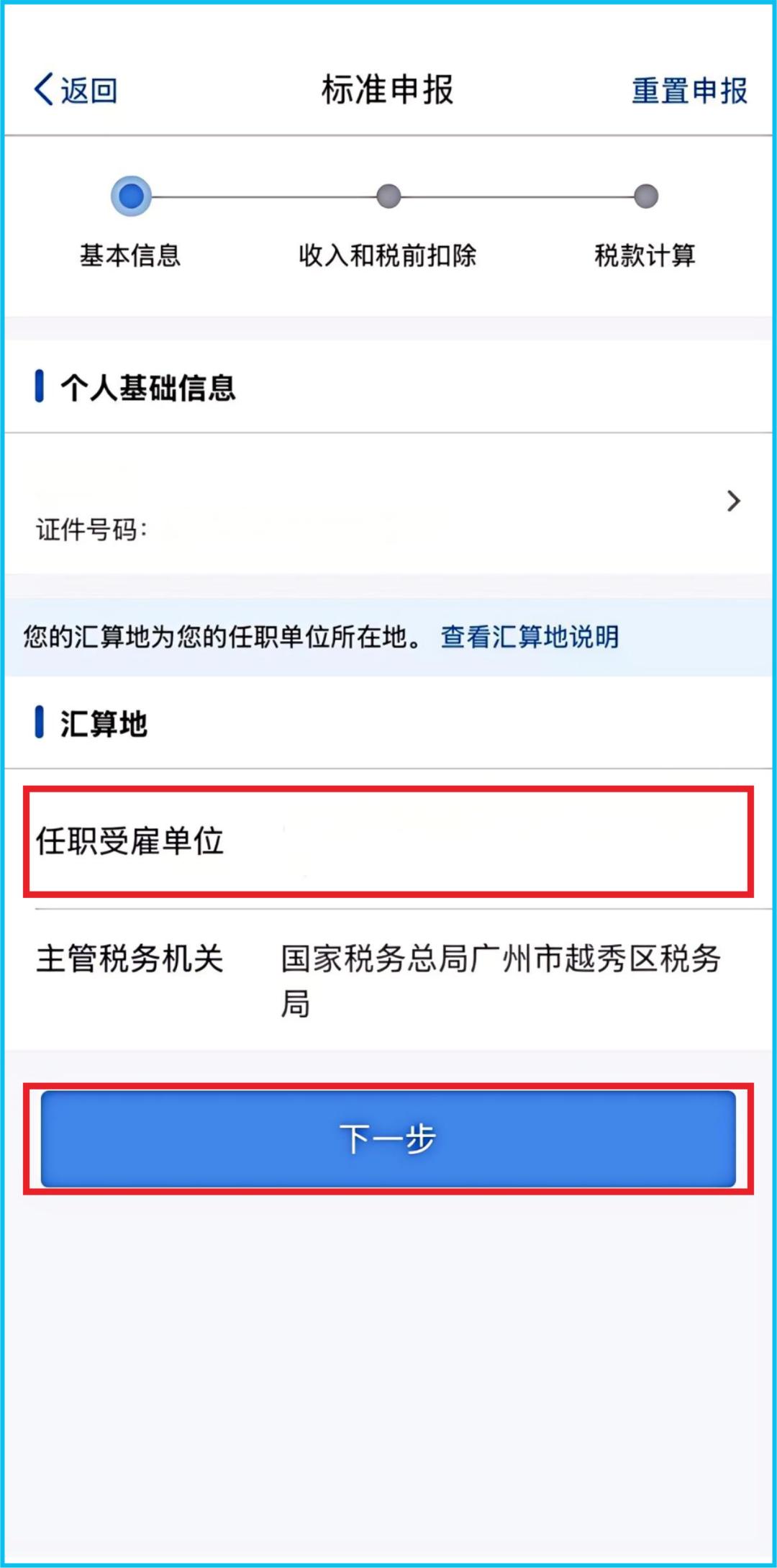 核对【个人基本信息】,选择或确定【就业单位】,点击【下一步】。如果没有就业单位,可以选择主要收入来源、户口所在地或者经常居住的地方。