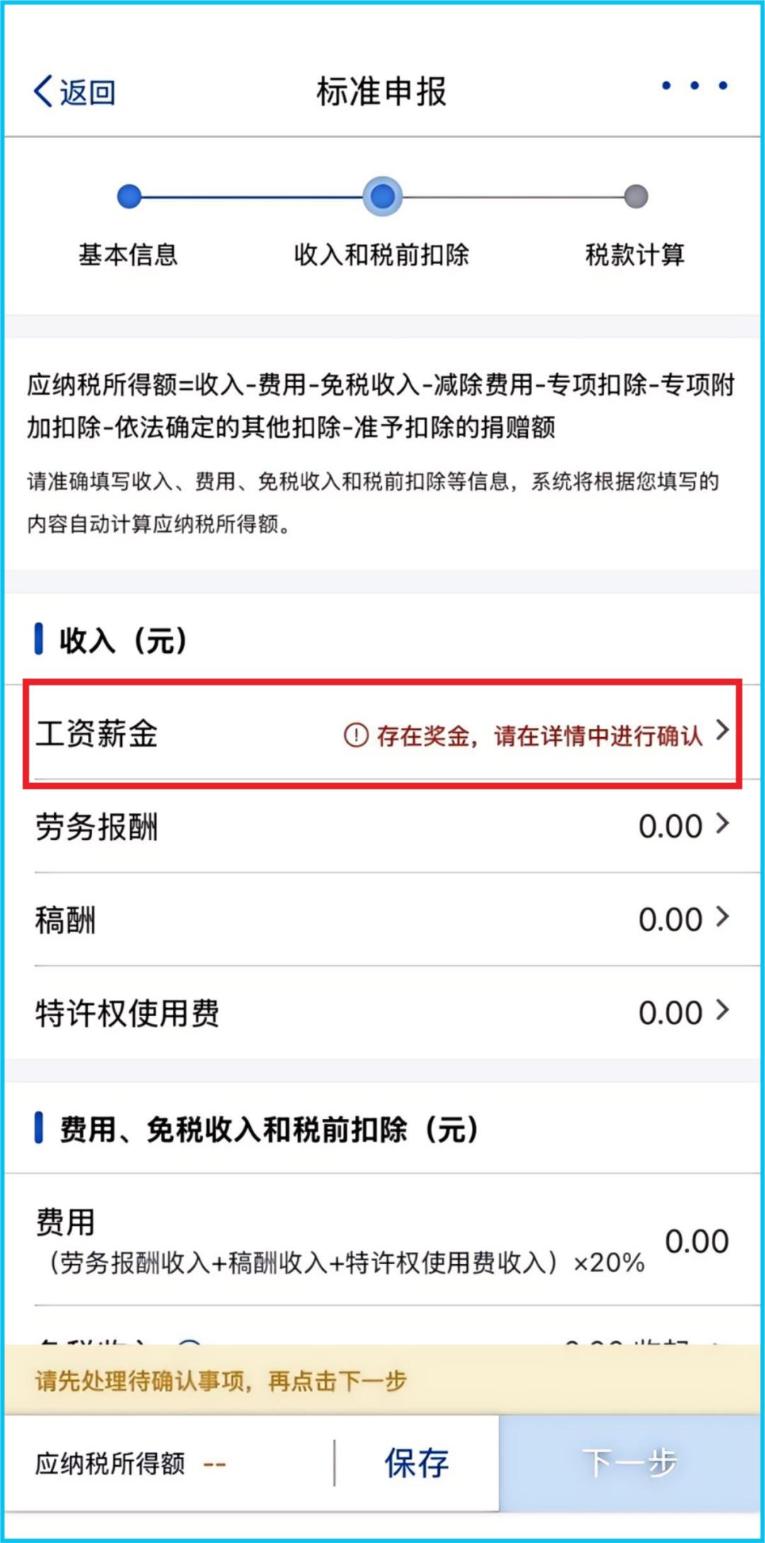 检查收入、费用、免税收入、扣除等特点后,直接点击【下一步】进入税务计算界面。请仔细阅读提醒内容,检查正确,点击【继续】。