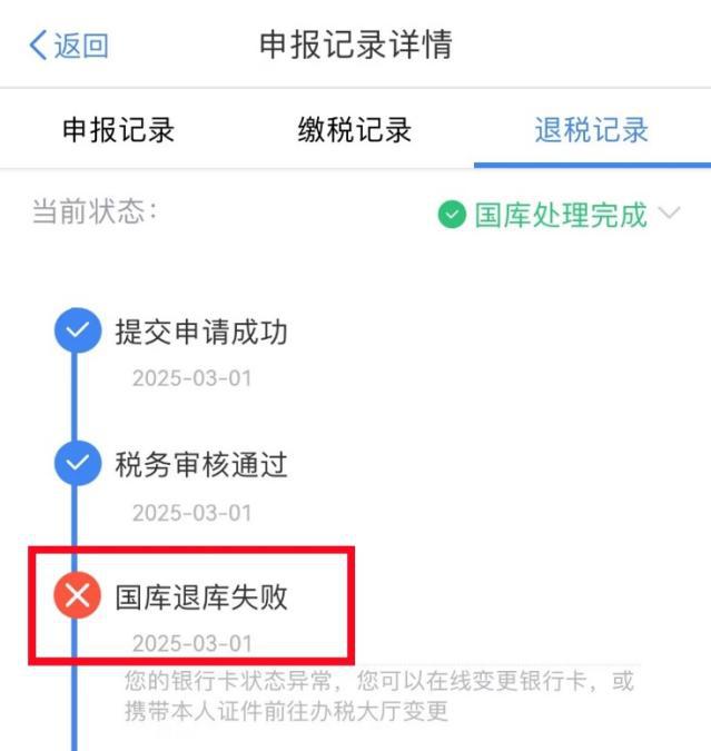 这意味着税收不能退还到你的银行账户。一般情况下,财务退货失败与你填写的银行账户信息错误有关。请注意申报退税的银行卡账户是否为本人账户,账户是否处于注销、报失、冻结、未激活、收支有限、不是一类卡的状态。如果遇到这种情况,需要重新填写符合条件的银行账户,系统会重新发送财务退款。