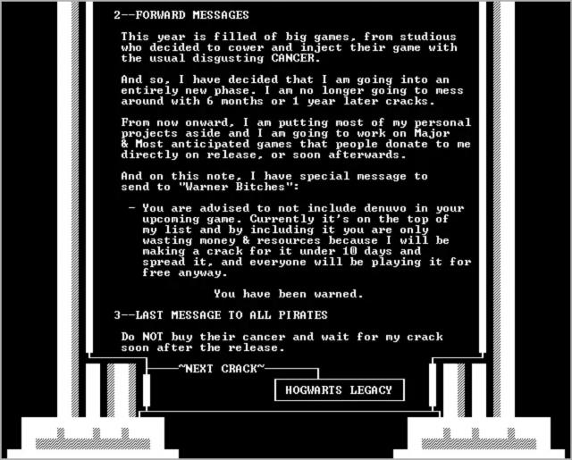 1918 华纳,一个百年老字号,已经足够牛逼了,结果就在这里。 2023 2000年,《霍格沃兹之遗》刚刚上映,女皇组就下了战书。文字大意是,游戏中恶心的防盗版方法会立即出现。 " D 加密 " 给予移除,否则就等待游戏在发布后十天内被破解。