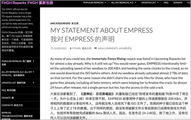 FitGirl 又被整不会了,发表公开声明说再也不用女王的破解程序来打包游戏了。