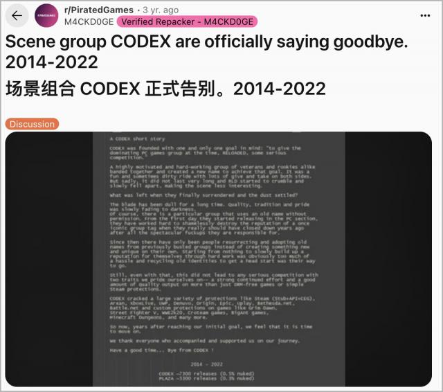 然而,近年来,越来越多的破解者像女王一样洗手, CODEX,就在 2022 2008年解散,参与破解老滚。 5 的 PLAZA,接着又宣布解散,留给玩家一个破解版的老头环作为离别礼物。