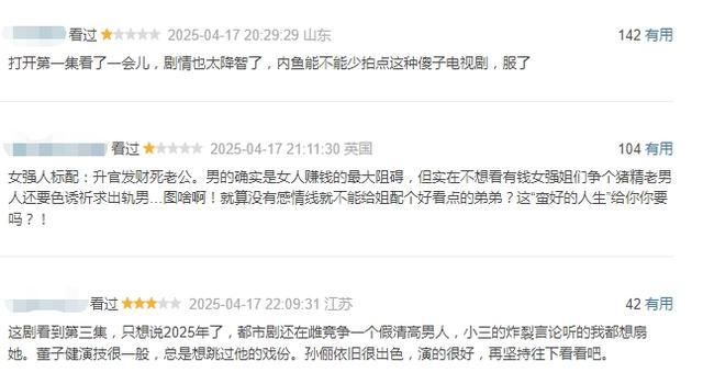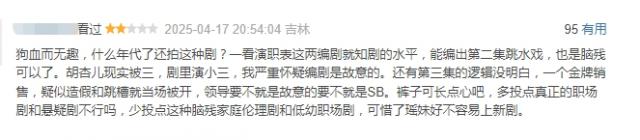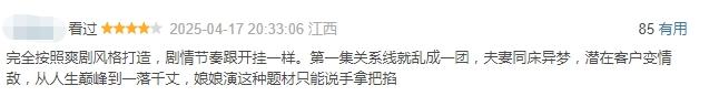 还有网友评论很犀利,觉得这部剧狗血而无聊,剧情降智,小三言论爆裂,说实在不想看这样的雌竞剧情。