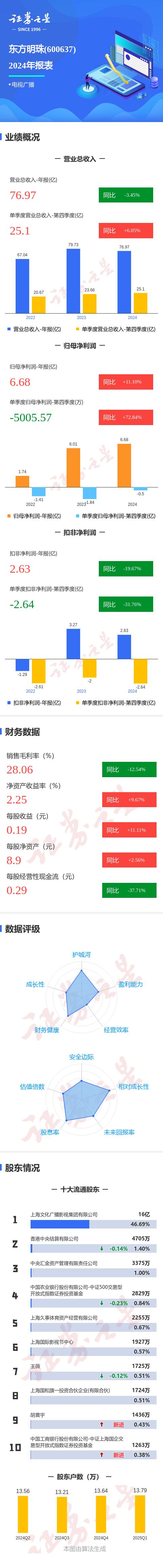 东方明珠证券之星消息 2024 年度报告显示,公司的主要收入 76.98 同比减少1亿元 3.45%;归母净利 6.69 亿元,同比增长 11.11%;扣非净利润 2.63 同比减少1亿元 19.68%;其中 2024 2008年第四季度,公司单季度主营收入 25.1 亿元,同比增长 6.05%;单季度归母净利润 -5005.58 一万元,同比增长 72.85%;单季度扣除非净利润 -2.65 同比减少1亿元 31.77%;负债率 投资收益20.31% 4.43 亿元,财务费用 -1.32 十亿元,毛利率 28.06%。