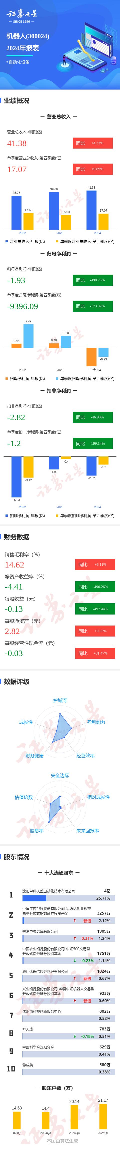 证券之星消息,机器人 2024 年度报告显示,公司的主要收入 41.38 亿元,同比增长 4.33%;归母净利 -1.94 同比减少1亿元 498.76%;扣非净利润 -2.82 同比减少1亿元 46.94%;其中 2024 2008年第四季度,公司单季度主营收入 17.08 亿元,同比增长 9.9%;单季度归母净利润 -9396.1 一万元,同比下降 173.33%;单季度扣除非净利润 -1.21 同比减少1亿元 199.15%;负债率 投资收益60.66% -8774.27 一万元,财务费用 3954.03 万元,毛利率 14.62%。