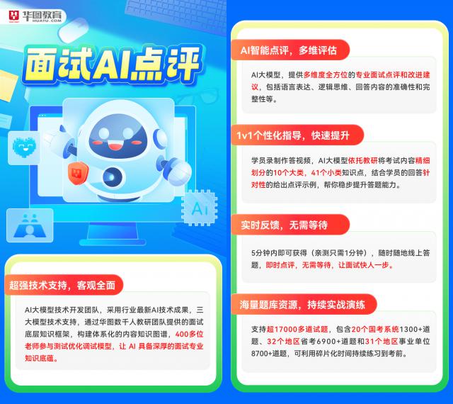 华图教育对高产品的重视,是产品革命、服务进化、企业变革的结果。就产品而言,以 AI 以面试评价商品为例, 1 对 1 实时分析技术,将标准化课程升级为个性化交付,以满足学员的需要。服务方面,从“知识传授”向“效果保证”转变 心理关怀"。就企业变革而言。提高教师待遇,实行全班制,创新班级管理,为高质量发展道路奠定组织基础。