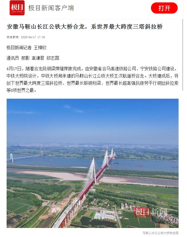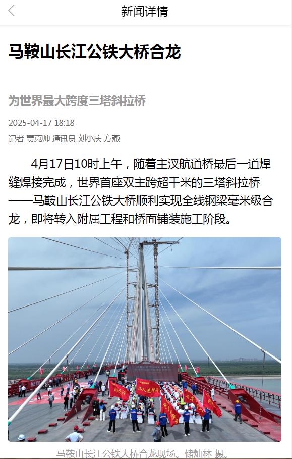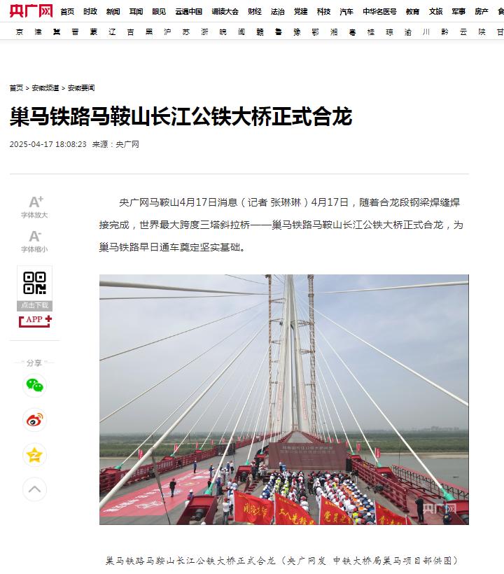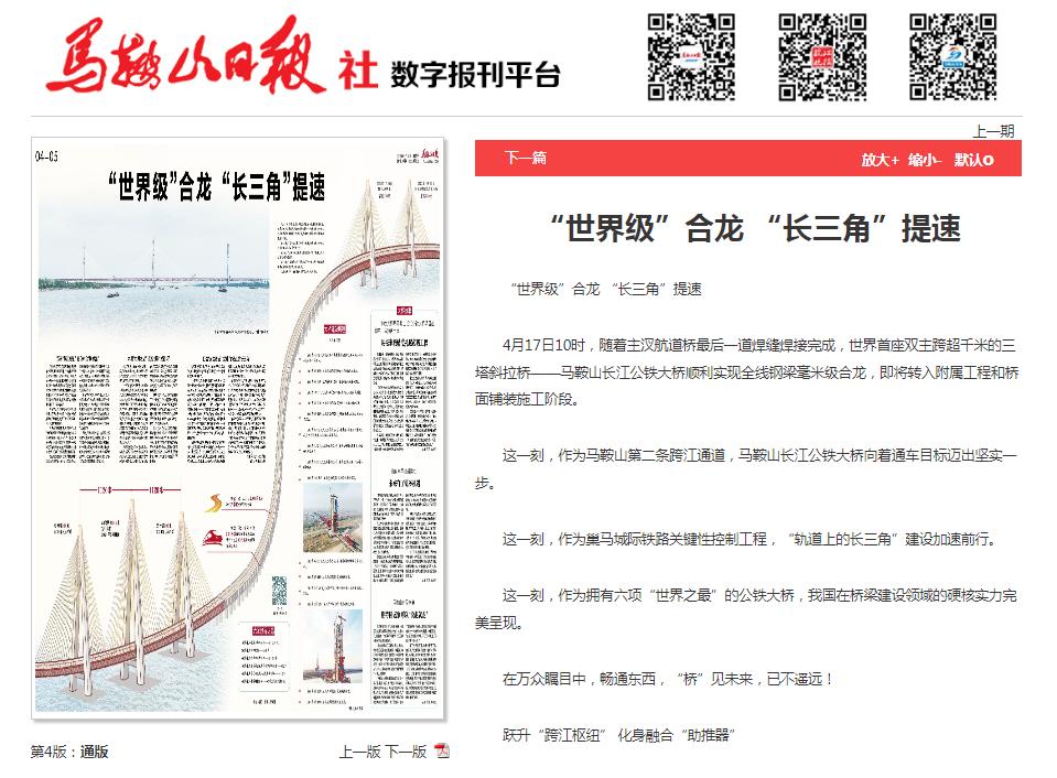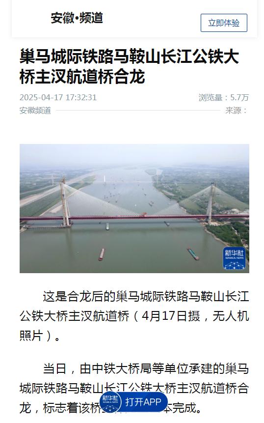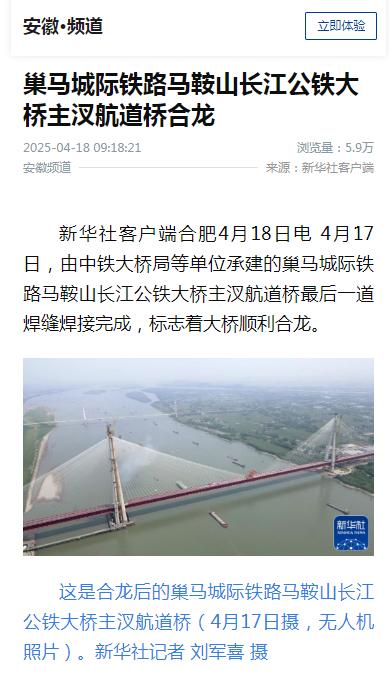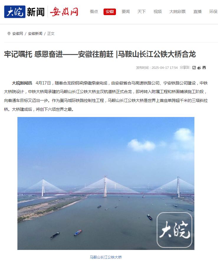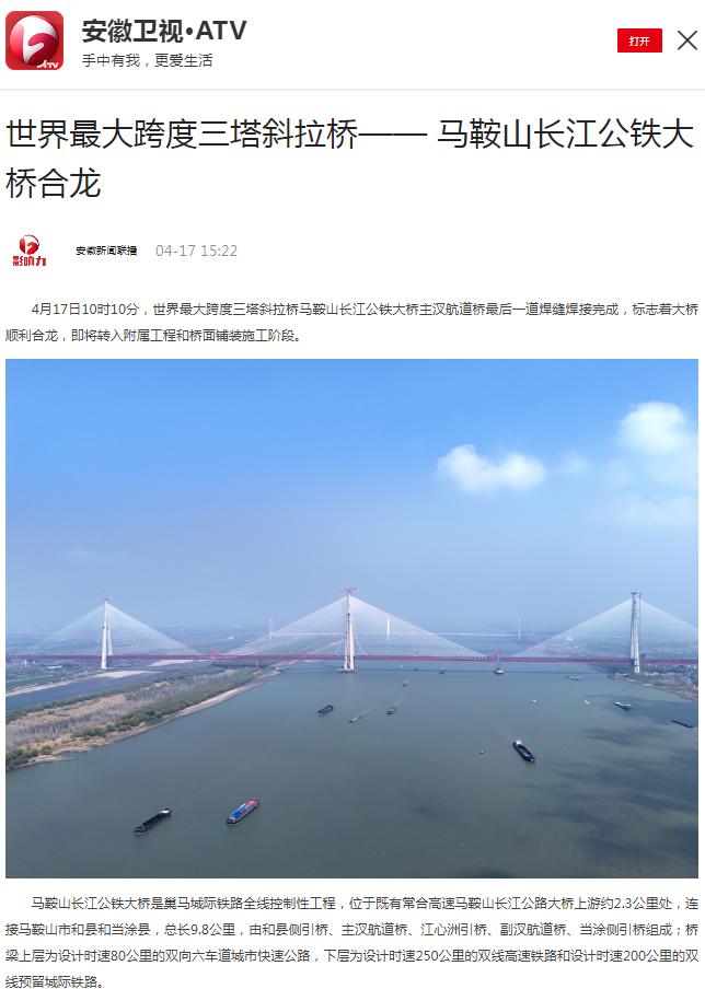 霸屏!看看主流媒体如何报道马鞍山长江公铁大桥合龙龙