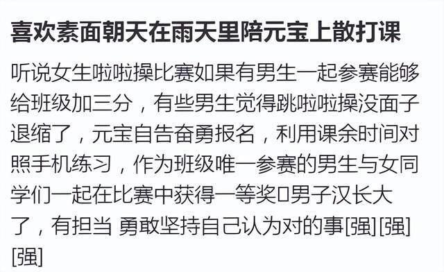 李思思还分享了最近发生在儿子元宝身上的一件事。她透露,元宝班的女生啦啦操比赛,如果有男生一起参加比赛,可以给班级加三分。但是,有些男生觉得跳啦啦操丢了面子,退缩了。然而,元宝自告奋勇报名,利用业余时间比较手机训练。作为班里唯一参加比赛的男生和女同学,他们获得了一等奖,为班级赢得了荣誉。