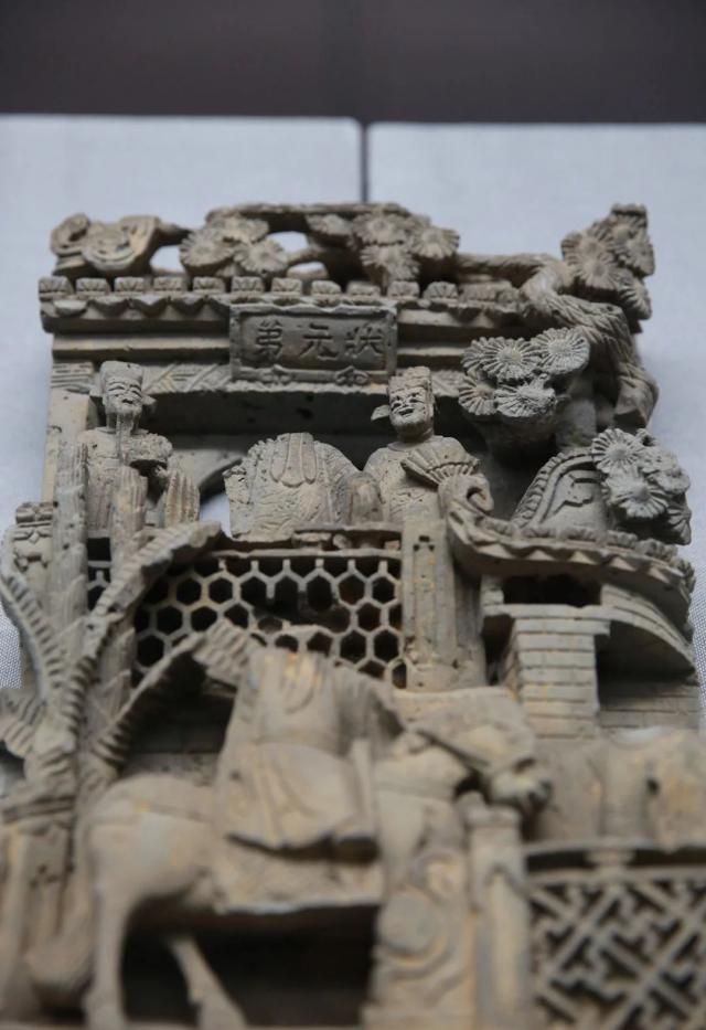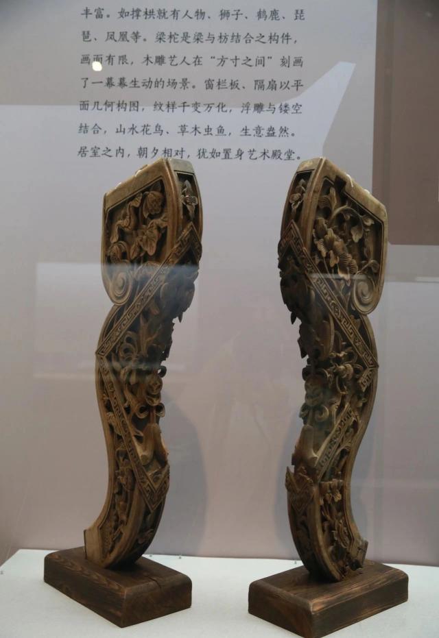 “徽州三雕”——木雕、砖雕、石雕是徽州工匠创造的建筑语言。展览中,木雕马纹雀结合各种技术,雕刻出优雅简约的花窗格扇,狮子滚绣球砖雕刻意味着美丽,如意卷云花边门楼雕刻简约大方。其中 39 砖雕(组),按压 “自然趣味”、“教育后代”、“美好期待”等主题分类,让观众感受到徽州人和中国人对理想生活的追求。