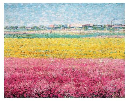 周碧初还创作了大量描绘上海风光、体现上海社会主义建设发展与生活场景的作品,成为上海城市珍贵的艺术记忆。这次展出的《春色》,描绘了上海郊区的风景,就是其中的代表作。在这幅画中,他有节奏地将玫瑰红的桃花、柠檬黄的菜花、粉绿色的麦苗、远处的工厂和房子形成了不同宽度的平行色块。从远处看,它们就像彩虹。艺术家们选择油画刀而不是油画笔来创作,以避免因色彩鲜艳而引起的习俗。用刀画画留下的粗糙感和粗犷的气息,促使画面呈现出强烈的质感和力量,总的来说构成了一种独特的美感,既宏伟又高贵,笨拙而深刻。创作于上个世纪的作品 60 时代,但在今天看来仍然是先锋。