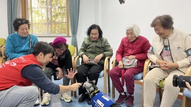 “狗爱夕阳红”——治疗犬公益活动,可爱的宠物来了。在志愿者的带领下,治疗犬与老人进行了一场跨越物种的温馨对话,让爱情在春天流淌。
