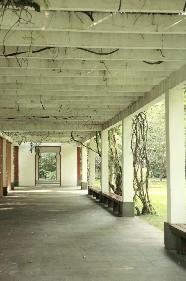 公园里的打卡点是这个小竹亭。经过多年的磨练,屋顶上的碎石斑驳陈旧,每一个痕迹都在诉说着过去的故事,散发着浓厚的时代气息。