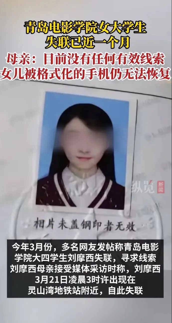 刘摩西的母亲在接受媒体采访时表示,刘摩西于3月21日凌晨3点出现在灵山湾地铁站周围,从此失去了联系。4月17日,记者从刘摩西的母亲那里了解到,她的女儿仍然找不到,也没有最新的线索。