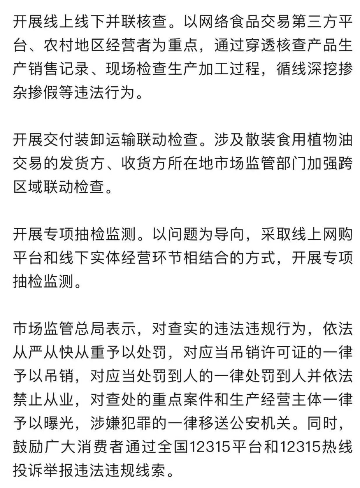 原题:“事关食用植物油,全国集中开展排查整治!”