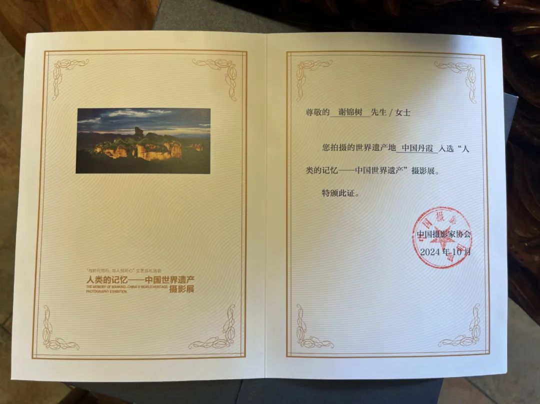 据悉,自1999年以来,仁化县摄影师谢锦树一直致力于探索、拍摄和传播丹霞山风光、丹霞地质地貌和人文历史主题,用摄影师的画面发现大自然的奇妙、丹霞的奥秘和家的和谐。本次展览的作品《中国丹霞》用镜头捕捉了丹霞山核心景区僧帽峰的“金碧辉煌”自然奇观,凸显了赤壁丹崖的层次感和立体感,展现了丹霞山的美。