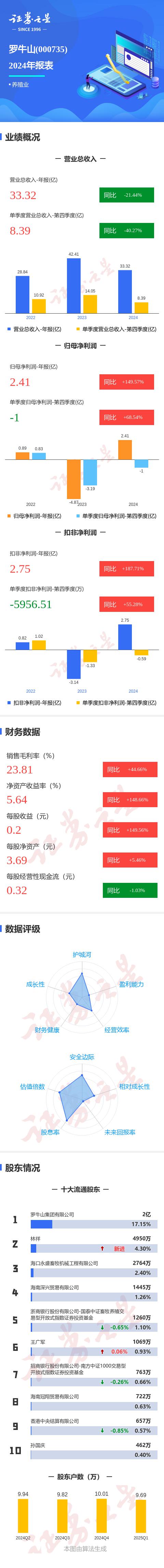 罗牛山证券之星消息 2024 年度报告显示,公司的主要收入 33.32 同比减少1亿元 21.44%;归母净利 2.42 亿元,同比增长 149.58%;扣非净利润 2.76 亿元,同比增长 187.71%;其中 2024 2008年第四季度,公司单季度主营收入 8.4 亿元,同比减少 40.27%;单季度归母净利润 -1.01 亿元,同比增长 68.55%;单季度扣除非净利润 -5956.51 一万元,同比增长 55.29%;负债率 投资收益54.77% 981.57 一万元,财务费用 4599.08 万元,毛利率 23.81%。