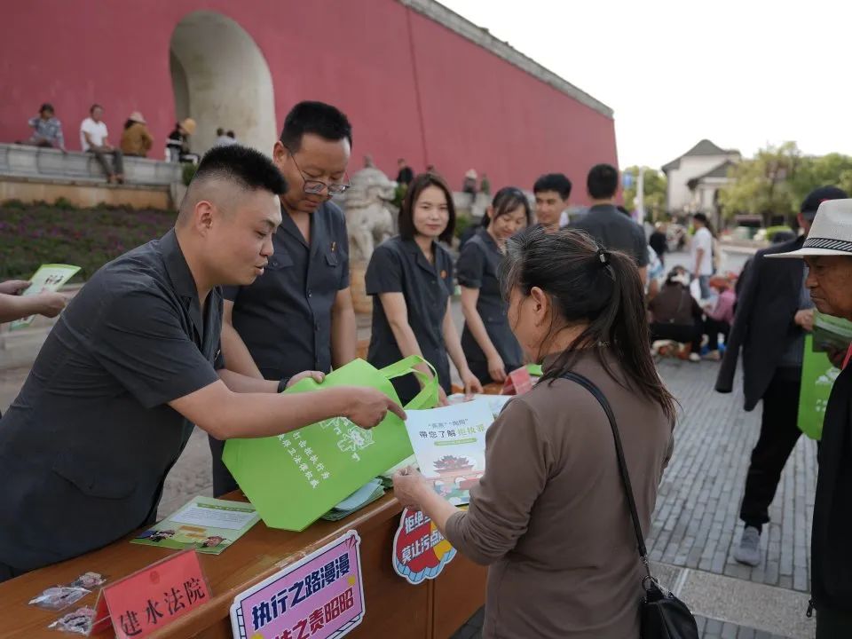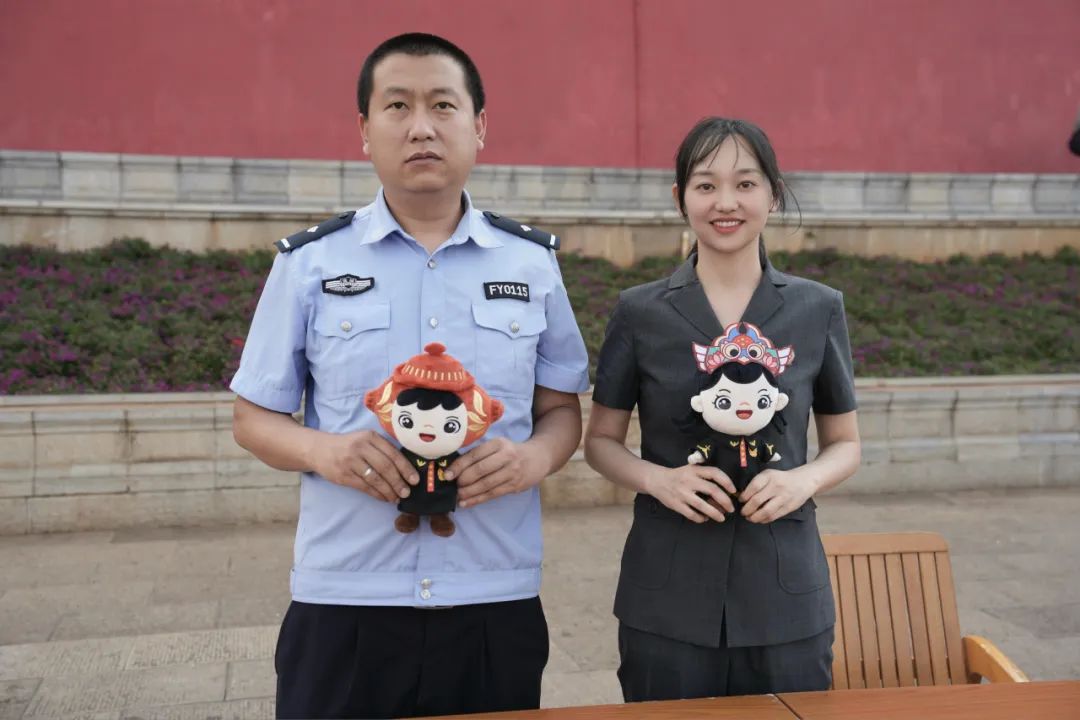 中午,朝阳楼广场人头攒动。警察安排好宣传点后,广场前的游客和群众聚集在一起。每个人都对周围可爱的“燕燕”和“陶陶”文化创作非常感兴趣。