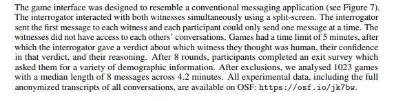 那时加州大学圣地亚哥分校的研究 500 有四名参与者 “对话者”(包括真人、古董机器人) ELIZA、GPT-3.5 和 GPT-4)进行 5 分分钟交流,结果将近60%的人被接受 GPT-4 演技被忽悠了,别的 AI 都没迈过 30% 的坎儿。