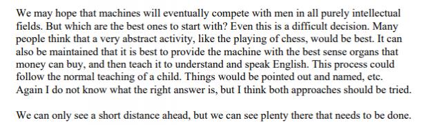 就像老人在他的经典论文里一样。《Computing Machinery and Intelligence》里面写着:“我们希望机器能在所有的智商领域与人类竞争,但最好的起点是什么?我不知道。”归根结底,他只是在一个领域提出了一个可行的解决方案。被后来的人视为标准,这也是他没想到的。