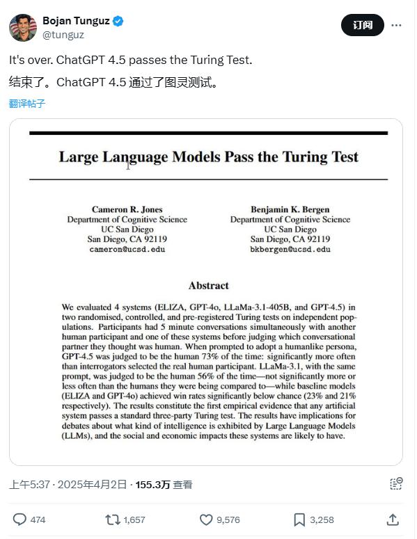 不久前,又有人拿了最新的。 GPT4.5 我做了测试。结果表明,它不仅通过了图灵测试,而且被视为人类的概率也高于真人!好家伙,现在有些人真的活得不如人机。