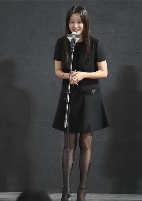 她穿着一件黑色的小香风连衣裙,短裙,还露出长腿,长发飘逸,金喜善笑得很开心。