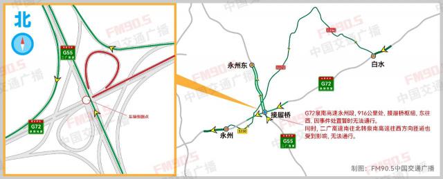 这位记者了解到,4 月 19 日 22 时 16 分,一辆运输快递的箱式货车正在运输 G72 永州段,泉南高速,916 公里处,接履桥枢纽匝道桥下侧翻,导致该路段东向西, G55 二广高速接履桥枢纽南向西的匝道无法通过。