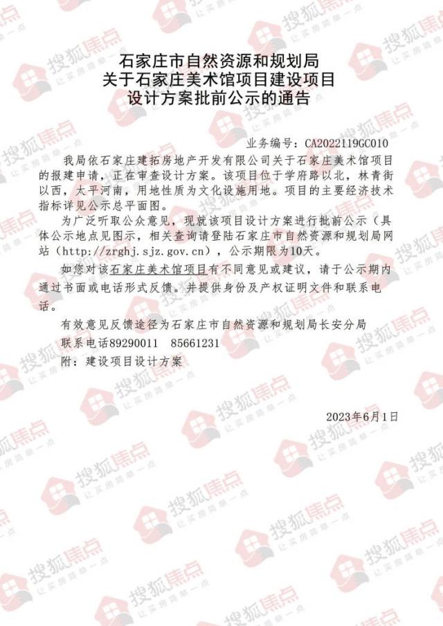 搜狐焦点“楼市快讯”报道:6 月 1 日本搜狐焦点了解到,石家庄市自然资源和规划局在批准石家庄艺术馆项目设计方案前发布公告。公告显示,该项目位于学府路向北、林青街向西、太平河南,土地使用性质为文化设施用地。
