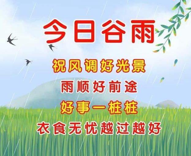 在谷雨季节,雨水渗透在地面上,春风吹过脸庞,万物生机勃勃。这似乎是一场自然的盛宴,让我们感受到生命的力量和美好的存在。愿你像春风一样轻松舒适,像谷雨一样沐浴幸福,生活充满美好和快乐!