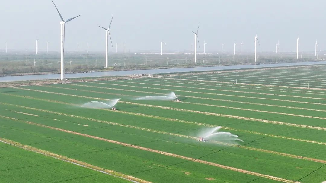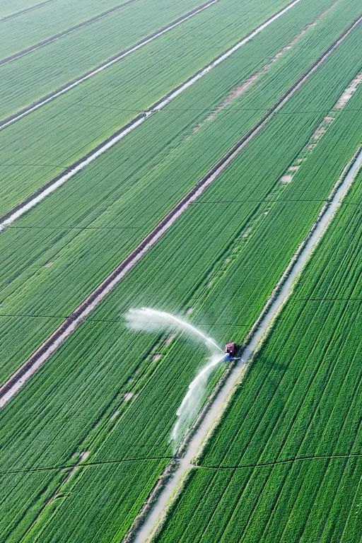 农业机械在田间灌溉小麦。