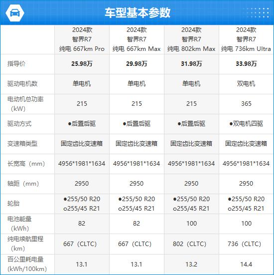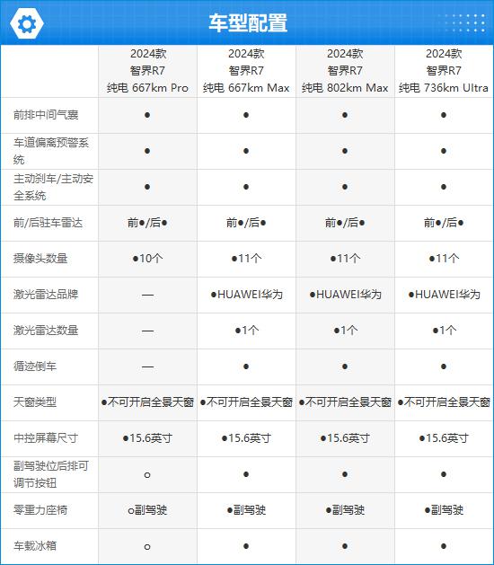 2024 款智界 R7 共推出两套动力配置 3 续航版可以选择,即使是入门级车型。 CLTC 还达到了纯电续航里程。 667km,能让用户基本摆脱“里程焦虑”。配件部分,客观来说,入门级车型确实稍逊一筹,主要是缺少激光雷达,其它车型的表现也不差。总体来看,2024 款智界 R7 同时也达到了“入门即高配”的标准,性价比非常高。